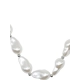 The pearls' organic shapes and varying sizes add a unique, artistic touch, while their lustrous sheen contrasts beautifully with the sleek, polished stainless steel chain.